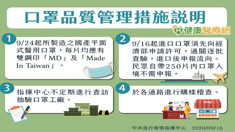 中央流行疫情指揮中心今原訂自109年9月17日起實施國產製之平面式醫用口罩,須逐片以鋼印標示「MD」及「Made In Taiwan」,由於各口罩廠鋼印滾輪安裝與軟硬體調校作業需要更充裕時間,且鋪貨至藥局及超商的物流工作需作業時間,經與各業者協調,將調整至9月24日起實施。